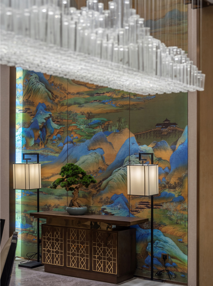 顺着水池景观进入二层营业区,以偌大的算盘为背景。千里江山图在二楼前厅以不同形式展现,相互联系又相互区别,赏心悦目。