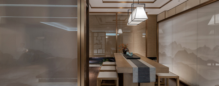 以简约的造型为基础,添加了宋代文化元素,使整体空间感觉更加丰富,空灵而不失活力、庄重而不厚重,有格调又不显压抑,可谓“曲径通幽处,禅房花木深”。